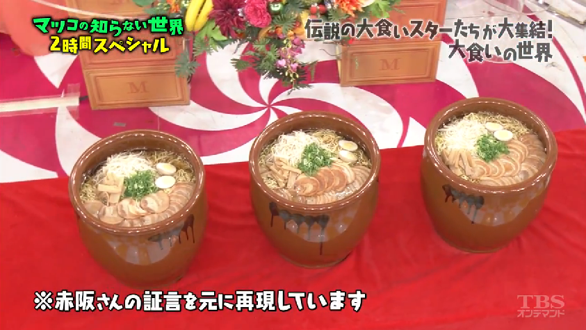 根據赤阪的形容,節目工作人員還原了當時的壺拉麵,每一壺大概是10kg左右。