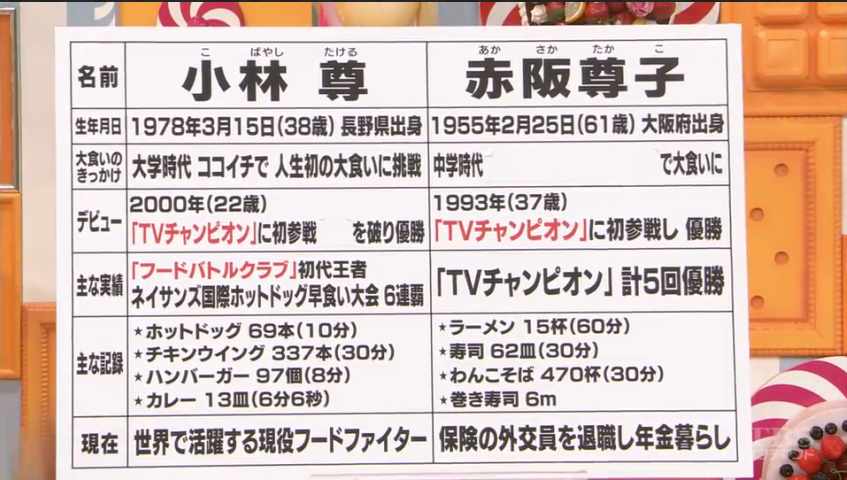 赤阪可謂第一代的大胃王,而小林則是第二代。赤阪是平時已經「大食」的類型,小林只有在比賽才會變得「大食」,平日都是吃普通份量的料理。