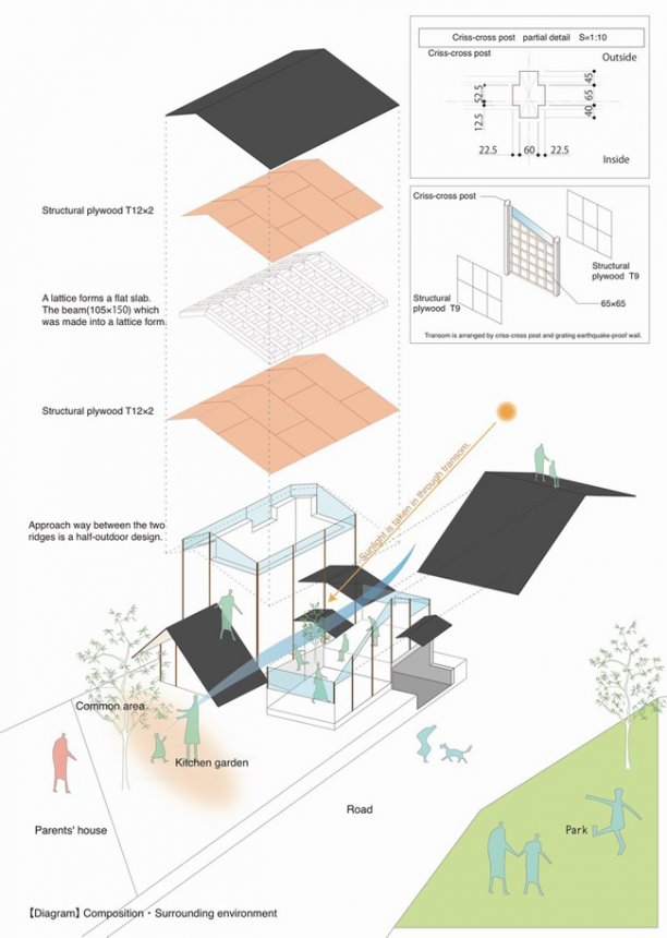 這間「屋簷下的房子」其實是個一家四口入住的住宅,外看似是不關連的各個大小的屋頂和住宅本體,實際上是相互連結,而屋頂就巧妙地分把建築物分隔出兩個區域,一方是廚房、客廳、車庫,而另一方就是睡房、閣樓。