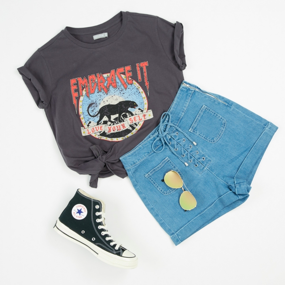想走歐美風,一件灰黑調的T恤是必須的!復古的圖案超有FEEL~還襯上蝴蝶結,帥氣而不失小女味~只要把衣袖略略卷起,整個感覺又榮升了!