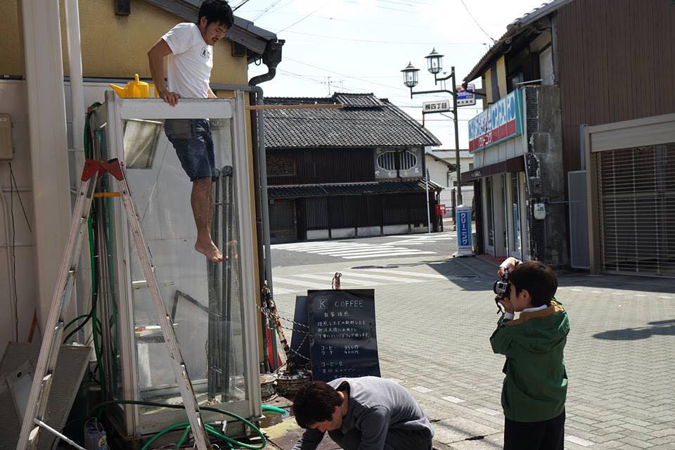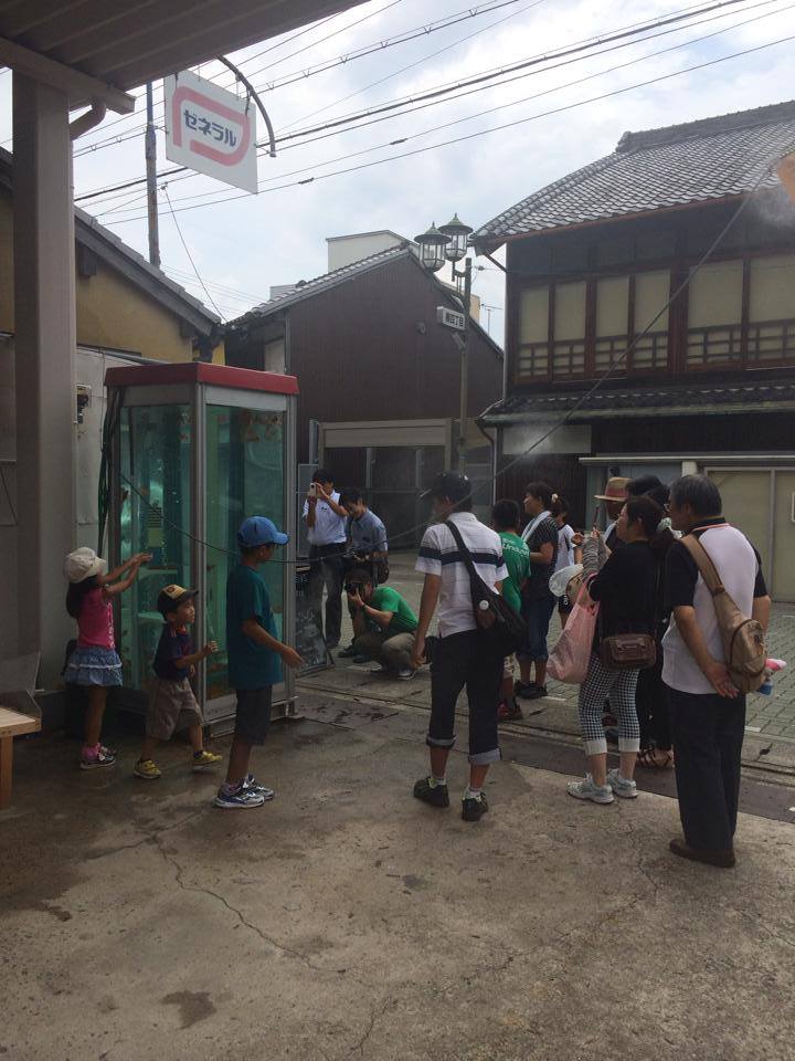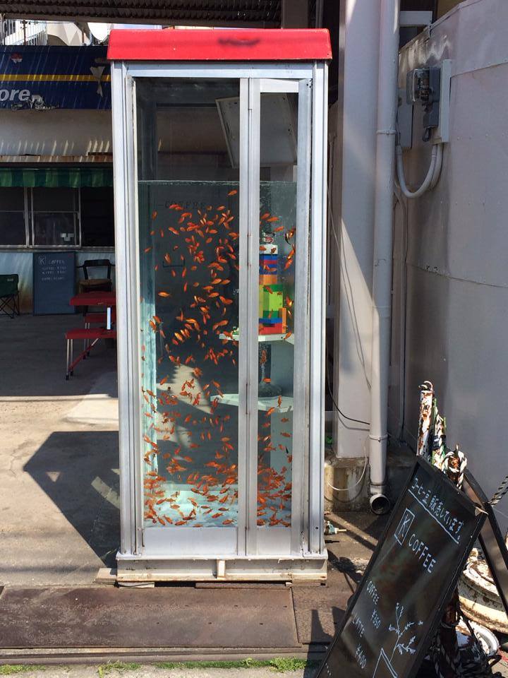 店主森和也先生說,這個金魚缸是屬於商店街的。在他的咖啡店外的空地是個公共空間,以前,這裡曾舉辦過藝術展覽,而這個金魚缸就是展品之一。當展覽完結後,商品街正考慮要保留還是撤走這個金魚缸。這時候,森先生就跟展覽負責人說,不如讓他試試打理金魚。於是,這個電話亭形金魚缸就得以保留在這裡了。