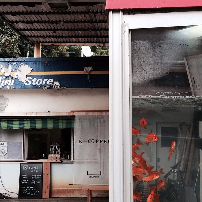 這個金魚缸位處一個舊油站,而看似是原來的油店便利店的一間小屋,現在掛出了「K COFFEE」的文字,變成了一間咖啡店。那麼,這些金魚就是店主養的?