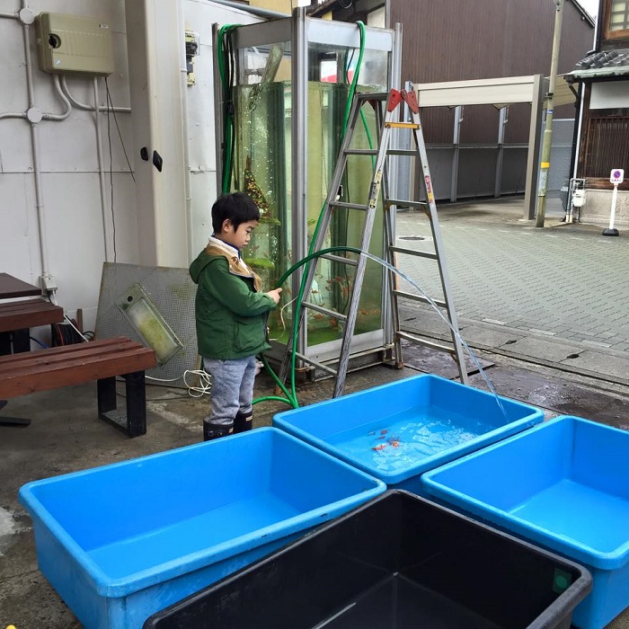 森先生回憶著最初接手照顧金魚的日子。那時候,每天把飼料放進缸裡,在日照下藻類生長得很快,缸裡的水沒多久就變得混濁。換走全缸水,又會令金魚適應不到而變弱,只能換掉半缸,然後不一會兒水又變濁了...一直維持著這樣的循環。後來,他在商店街買了一個過濾器,才令缸裡的水保持在穩定的狀態。