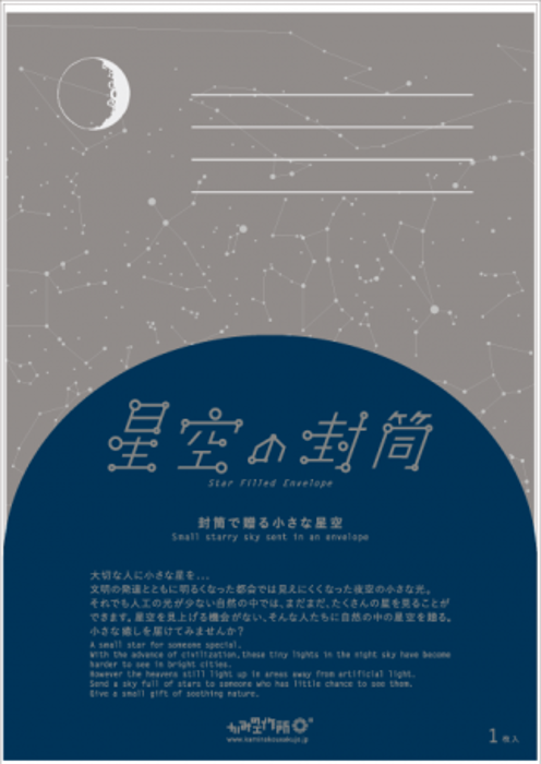 設計出「星空信封」的人,就是現正於京都美術大學就讀的塚田萌小姐。據她表示,希望星空信封可以為居於城市中的人,都可以透過欣賞點點星光,把一天的煩惱除去,從而得到療癒的感覺,讓心情變得輕鬆舒暢。