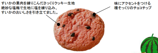 這款西瓜曲奇加入了西瓜果肉,再以鹽調味,令西瓜味道更突出,亦可幫助補充因流汗而流失的鹽份;最後再灑上朱古力碎,模仿西瓜的種子。