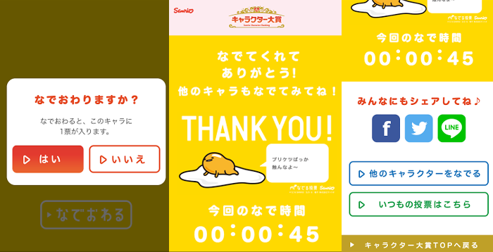 ▼完成之後,就進入投票程序,這亦是最好玩的地方。因為大家只要不斷點擊營幕,除了會彈出七彩繽紛的心心之外,所選的角色也會做出很多有趣的動作及反應,而小編為例,投蛋黃哥時,它竟然以擺動那令人治癒的屁屁來回謝小編的一票。