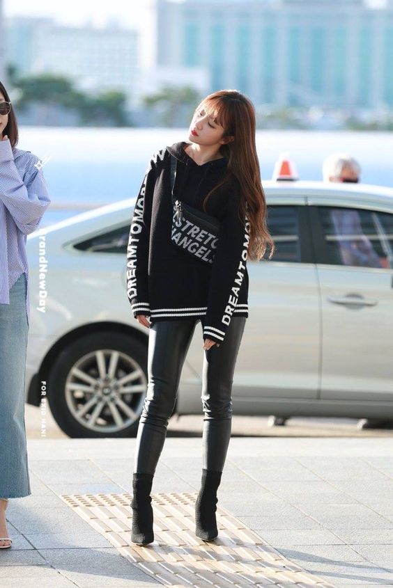 全黑造型保守又經典,但是配搭不好會變成路人。所以HANI選擇了黑色皮褲來增加畫龍點睛的效果,再搭配斜孭袋,把衛衣收窄收短,整個人看起來就不會比例不均。