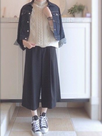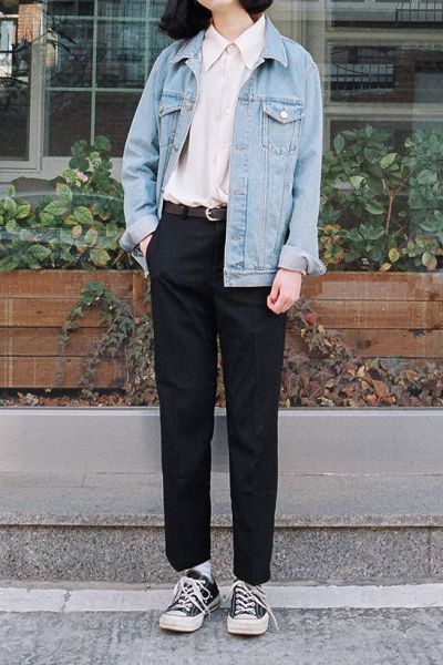 不想穿牛仔褲的話,穿西裝褲子配牛仔外套也別有一番風味~