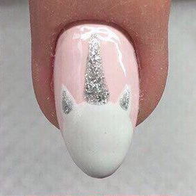 1. 使用粉紅色指甲油打底,然後用白色指甲油畫出獨角獸的形狀。