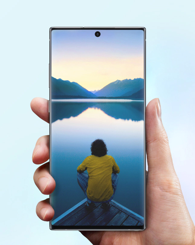 O 型前鏡頭加窄邊框曲面螢幕設計,讓Note10 的螢幕佔比達到93.7%,Note10+ 則高達 94.2%,獲得VDE Germany認證的Dynamic AMOLED螢幕,不只降低了 40% 的藍光,還以2,000,000:1對比率,呈現真實色調和對比,讓畫面更加驚豔生動。