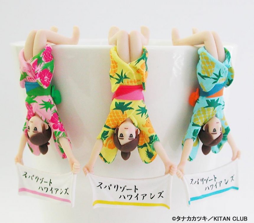 福島常磐市的限定杯緣子,是以該市的夏威夷渡假村為主題,小女孩倒掛的身體,穿著印有朱槿(扶桑花)與鳳梨圖案的浴衣。