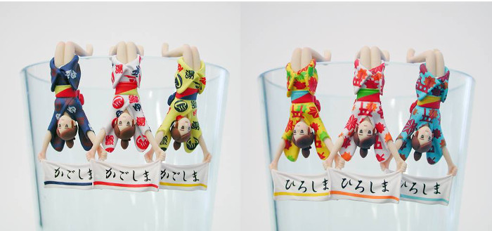由廣島和鹿兒島推出的杯緣子,同樣都是以浴衣為主題,廣島的款式就印上楓葉與鳥居,而有「溫泉王國」之稱的鹿兒島,當然是印上溫泉的圖騰。