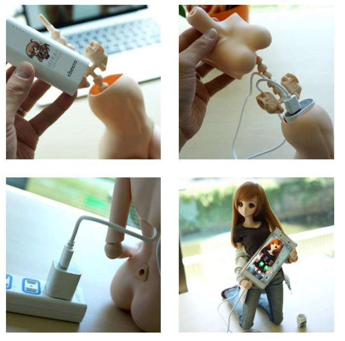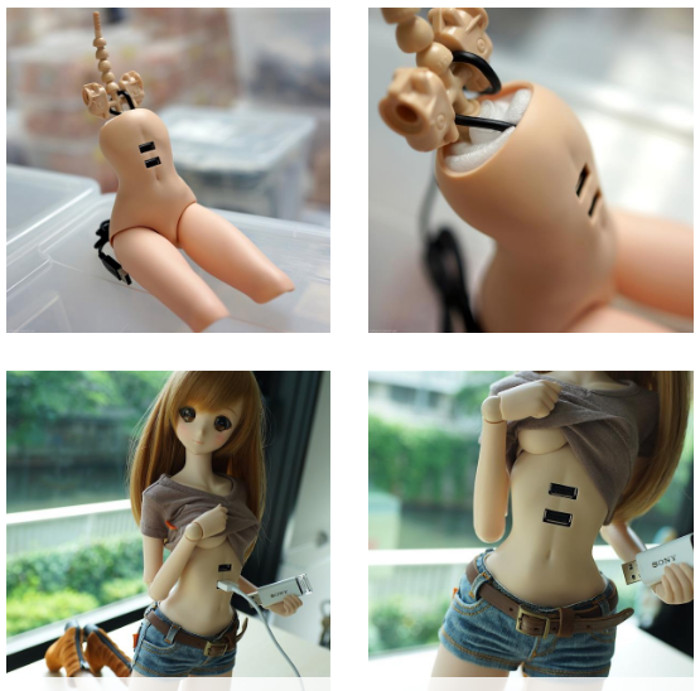 以上介紹的產品同樣都是60cm高,全身的關皆可郁動藉此擺出不同的姿勢,用家可為公仔隨意換上各種服飾打扮,另外公仔有男性或女性,迎合不同人士的需求;既然是Smart Doll,基本人偶配上電池之後,就可以為手機充電,而這款USB素體的最大特點就是與用家的電子產品進行互動,公仔身上有多個USB插口令它的用法多變,可聯接鏡頭、USB或電腦來使用。