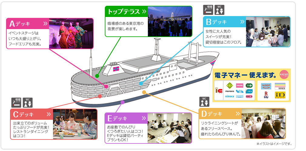 一般的船票(包括在船上任吃任喝)是2600日圓,在平日穿浴衣上船的話,還會獲得1000日圓的折扣呢﹗除了這種折扣,也可以事前在網上預約,票價也會便宜一點。