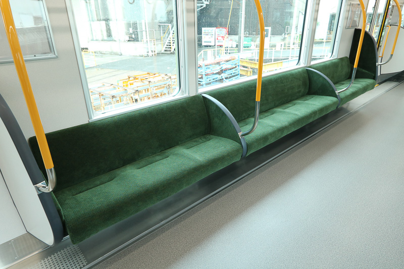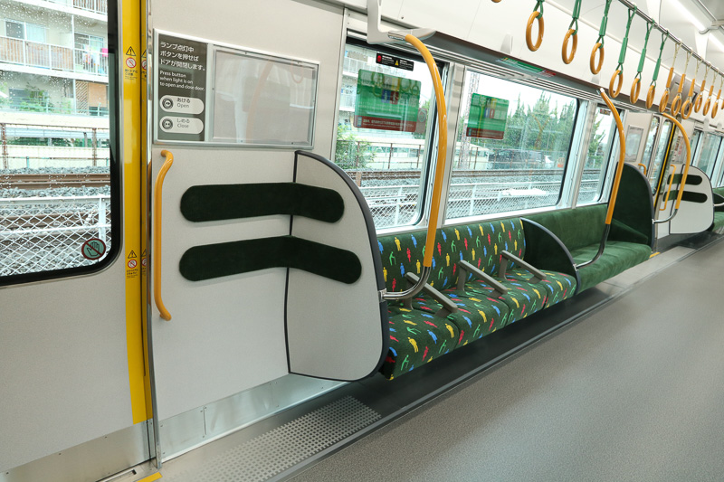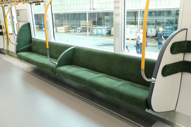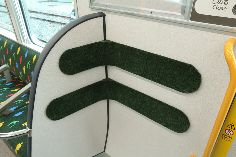 ▲這列電車是8卡編成,而8號車在順時針(外回り)方向行駛時位於最前,在逆時針(内回り)方向行駛時位於最後。這個車廂預計在大阪站會是最繁忙的一卡,故此在車廂內的設計下了一些工夫。例如,其他車廂的長椅都設成10人座位,而8號車的則是8人座位,增加了車門旁邊站立的空間。而在這個站立的位置,牆壁上裝上了可以倚靠的條狀緩衝墊,在人多擠迫及車廂搖晃的時候也能借力站穩。