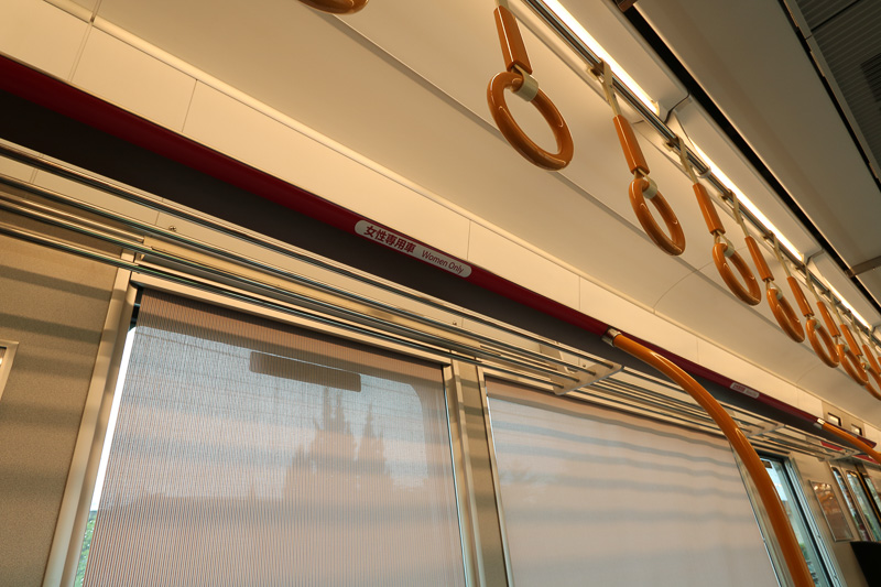 ▲323系電車的女性專用車廂(4號車),從用色到佈置都跟其他車廂不同。車身的線條顏色換成粉紅色,而車廂內的照明是偏黃色的。