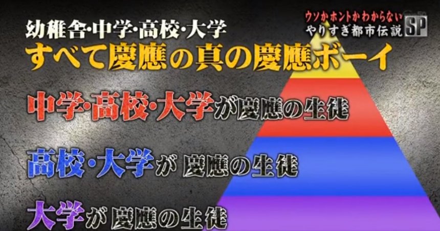 這樣的都市傳說除了真正就讀過慶應義塾幼稚舍的人,恐怕很難去確認真偽。不過,2004年採用福澤當10000円的財政大臣和當時首相小泉純一郎都是慶應大學出身是真的;幼稚舍 6年裡也不會調班,不會換班主任也是真的。看電視中的「慶應BOY」對答,也會看得出慶應系列學校的學生們即使畢業後也有很強的聯繫網絡。但這種即使畢業後,在工作或者交友場合遇見同校出身的人,也要講「前輩後輩」的氣氛,就不是每個人受得了。