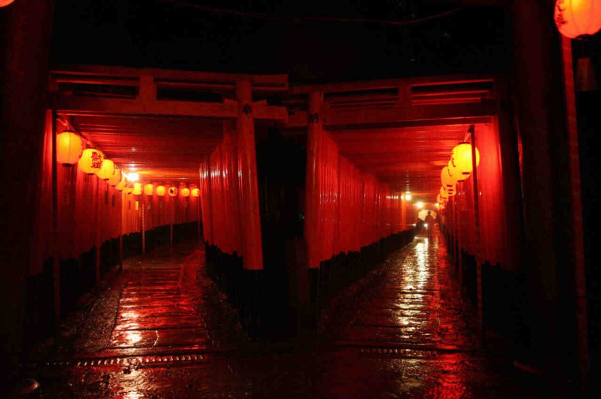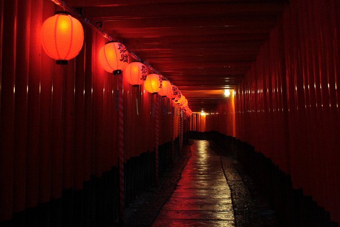 ▼看似無止境的千本鳥居,在紅色燈籠的照明下,更顯神秘,不禁讓人聯想到吉卜力動畫《千與千尋》的意景。