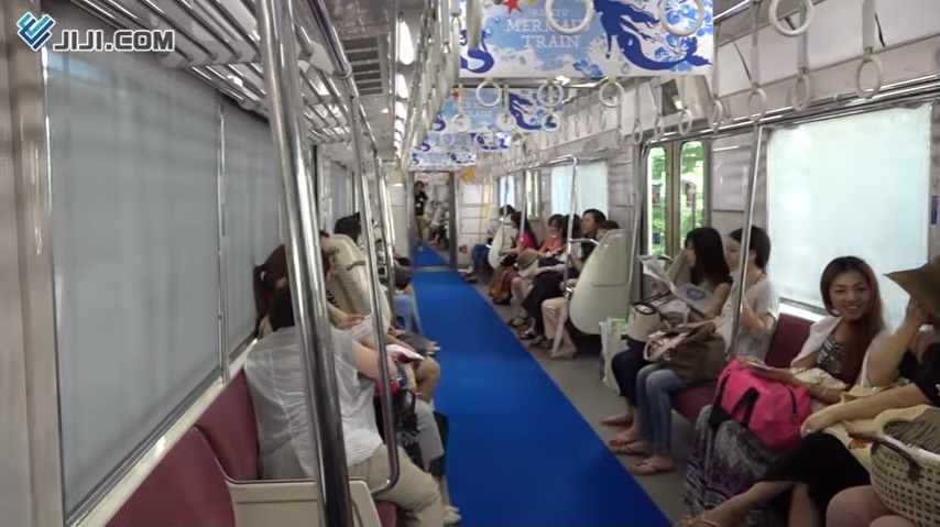 其實這是由京濱急行電鐵與三愛水著樂園合辦,名為「マーメイド・トレイン (Mermaid Train)」的宣傳活動,於剛過去的7月31相隔54年再度復辦。是次活動以「電車內舉行的水著花生騷」為概念,作為三浦海岸海水浴場宣傳活動的其中一環,目的旨在向大眾傳揚盛夏於大海暢泳的樂趣。