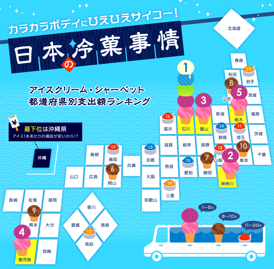 石川縣的家庭(二人或以上)平均每年會花10600日圓在雪糕及雪葩等冰品上,是唯一消費超過五位數的縣。排第二名的是神奈川縣,平均每年的消費為9867日圓,而第三名的是石川縣旁邊的富山縣,消費額為9602日圓。