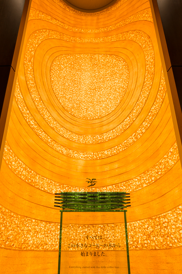 ▲在博物館接待處的天井,開了個多邊形天窗,以和紙遮蓋。據館內職員介紹,和紙灑上了咖啡粉,而天窗周圍伴以四根橙色燈光的柱子,營造出一個優雅的空間。