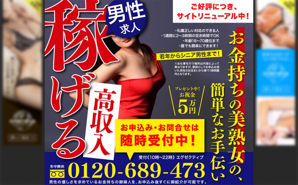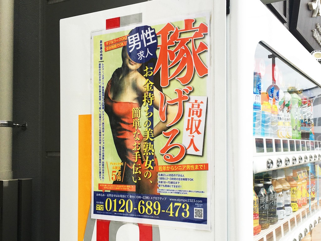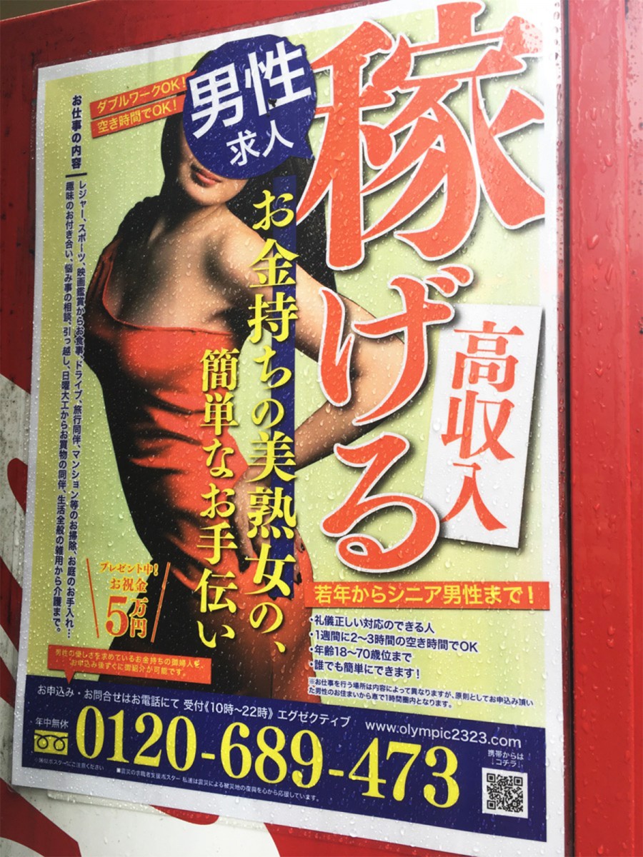 在這位記者的家附近,到處也張貼了這張「徵求男性」的海報。海報大字標題的寫上「賺取高收入」、「為富有的美熟女作簡單的幫忙」、「送禮中﹗祝賀金5萬日圓」等字句,又列出了要求︰18至70歲,待人接物有禮,一週只要花兩三小時,誰也可以做到。