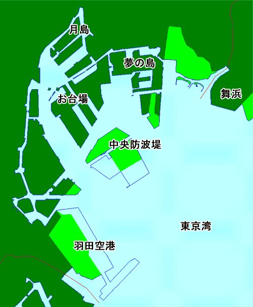 ▲東京灣畔的羽田空港、中央防波堤、台灣、夢之島、舞濱等地區全是「人工島」