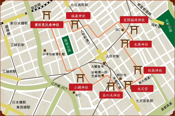 「七福神」是指惠比壽、大黑天、毘沙門天、弁財天、布袋尊、壽老人及福祿壽七位神明。祂們各自有不同的「功能」,而巡遊七福神(七福神巡り)在各地都是相當流行的活動。在東京都的日本橋人形町,供奉著這七位神明的神社非常接近,故此可以最短的時間來完成巡遊,對於快人一步的香港人來說實在是最適合不過了。