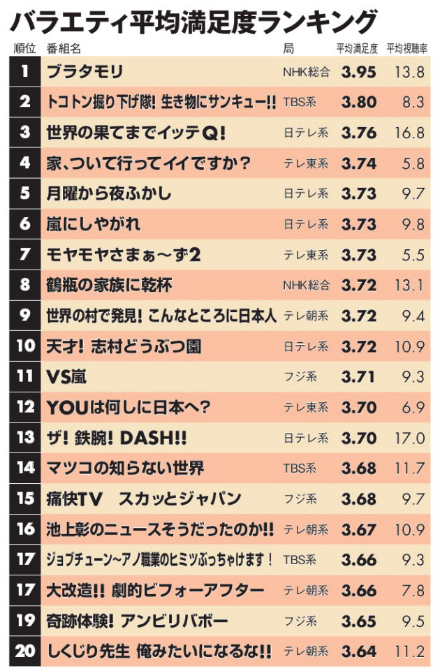 ▲2016年日經Entertainment調查中,在綜藝節目滿足度的排名中,《家、ついて行ってイイですか?》和《Youは何しに日本へ?》分別奪得第4和第12的高名次。