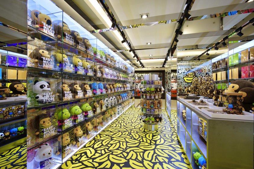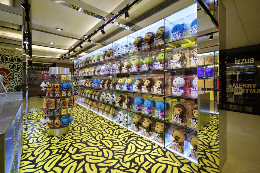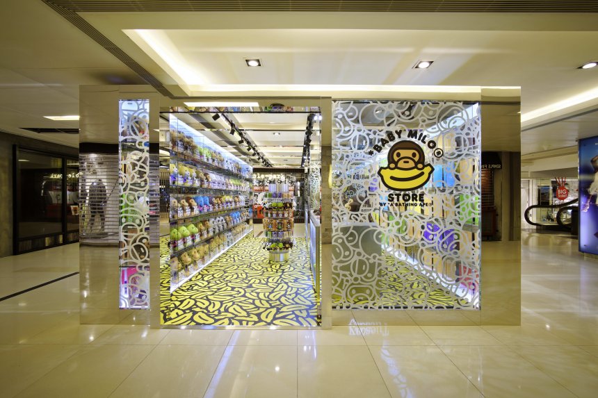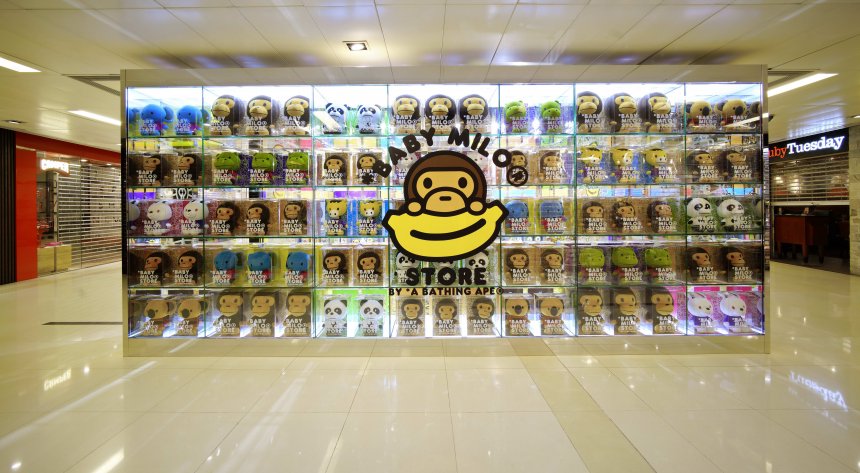除了沙田期間限定店外,銅鑼灣希慎道I.T.的期間限定店更設有夾公仔機為裝飾,落足重本!而銅鑼灣時代廣場的主題概念店的店舖中央位置,更長期擺放著1米多高的BABY MILO公仔,成為店內標指性地標。各位 BAPE 趁這段期間快把握機會參觀!
