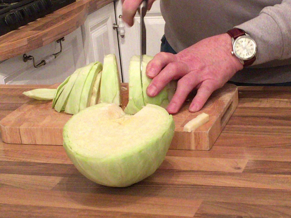 而最重要的是切開的畫面。把椰菜對半切開,再打直切下去,效果竟然和《夜明前》切的菜近乎一樣……