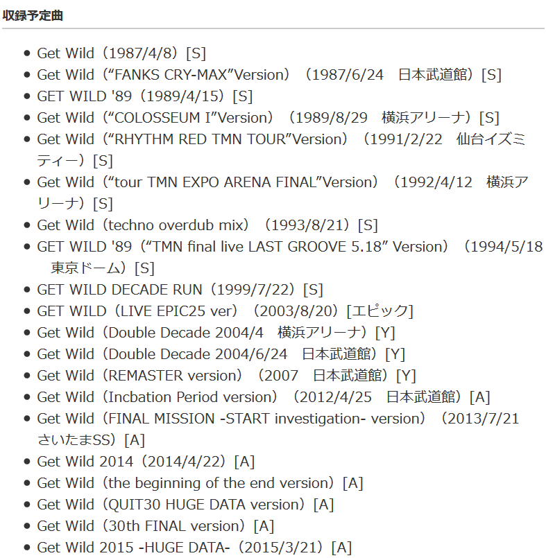 33首《GET WILD》未全部確定,但TM NETWORK已在AMAZON上公佈了其中20首。除了原本收錄在CD的版本外,還有各種在演唱會上唱過的不同版本,甚至會有其他藝人的翻唱或合作版本……