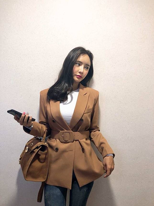 也可選擇腰帶設計的奶茶色西裝外套,溫柔外別有一點復古的美麗喔!