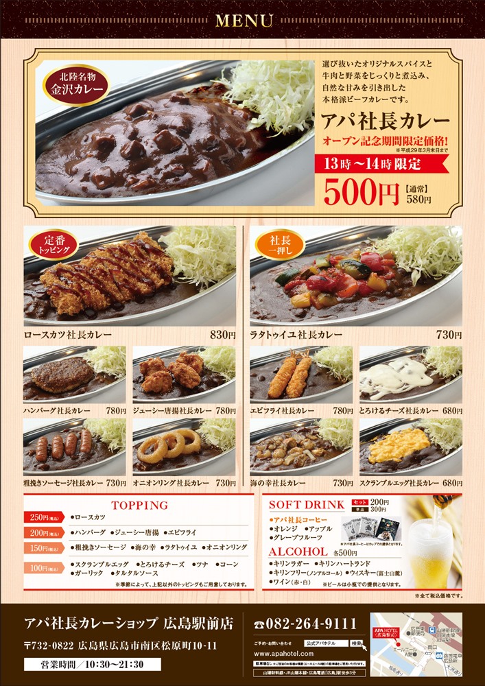 在2月19日於廣島站前店,第一間「APA社長咖哩店」(アパ社長カレーショップ)將會開張。從餐廳的標誌可以看到,元谷社長終於沒有露出真人的肖像了,而是為社長二次元化,加戴上廚師帽。