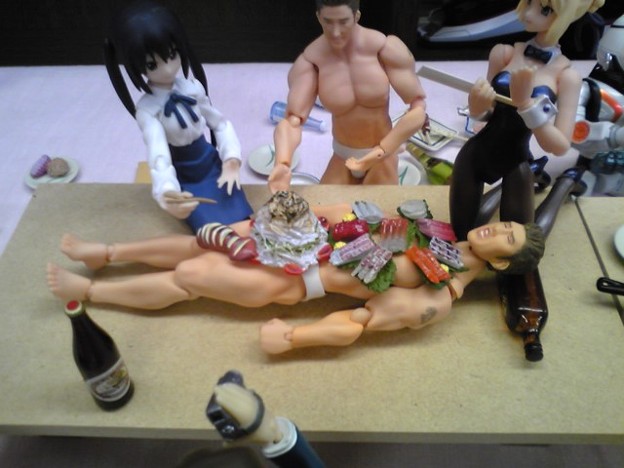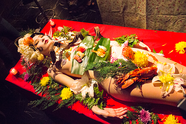 我想,不少人也有聽過什麼是女體盛,就是在女性的裸體上擺放食物,當你越吃越多時,掩蓋的部份越來越少,還不知道?看看下圖吧: