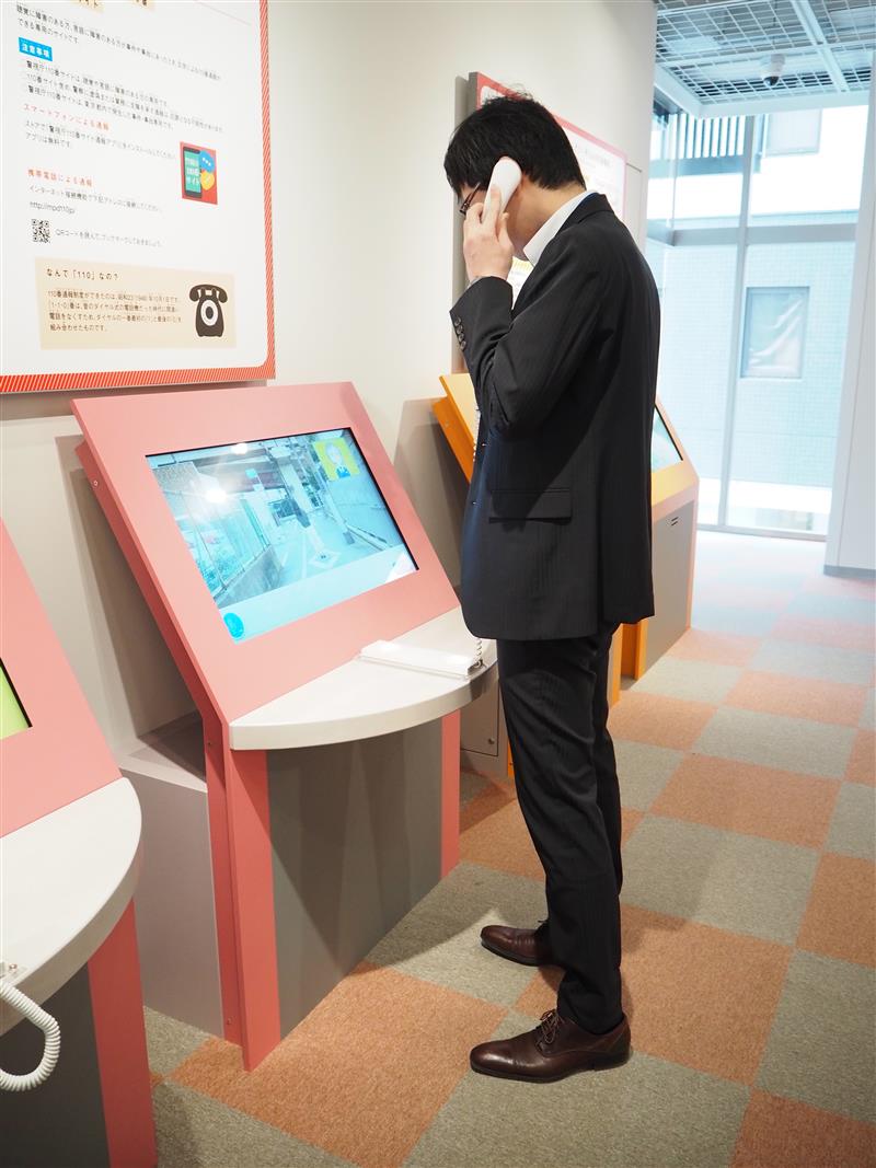 未報過警,不知道當需要報警時該如何開口?這裡有個「110(日本報警電話號碼)體驗區」,還細心劃分作成人區及小童區,確保大家都知道如何報警。