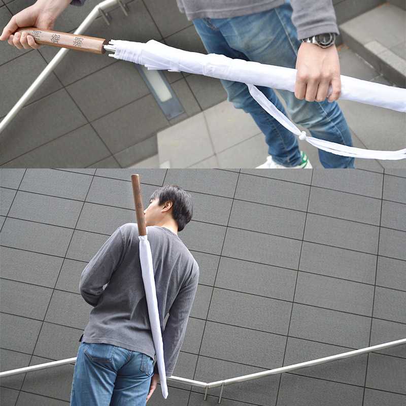 很中二呀……但如果掛在身後,這樣子拿傘就不會弄到別人?