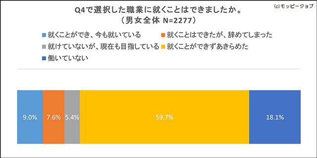 當受訪者被問到「你達成了兒時的夢想職業嗎?」,約六成人回答「做不到,已經放棄了」,亦有約兩成人回答「沒有在工作」。另外,有少部份受訪者非常積極,指「雖然仍未達成,但為了達成而努力中。」只有大約16%的人得到夢想職業的機會,但當中有7%的人拒絕了工作邀請。