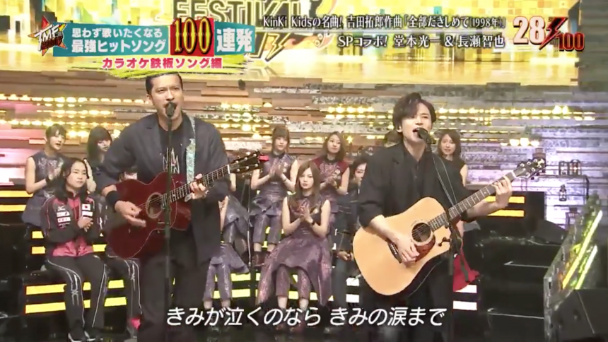 今年結成20周年的KinKi Kids成員,38歲的堂本剛在早前出席東京電視台的音樂節目時,因為突發性失聰的關係而缺席,而要突發地打電話給 TOKIO 的長瀨智也,請他充當 ピンチヒッター(緊急時候的打手),跟堂本光一唱了《FLOWER》和《擁抱全部》。
