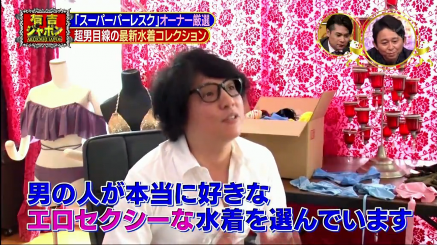 接著下來,就要介紹受男性歡迎的泳衣!2017年最流行的泳裝是植物圖案的兩件式泳裝,女性可能會覺得很時尚,但男性只會覺得「看不到胸部!」於是,《有吉ジャポン》就請來東京burlesque的店主精選些男人喜歡的女性泳裝。