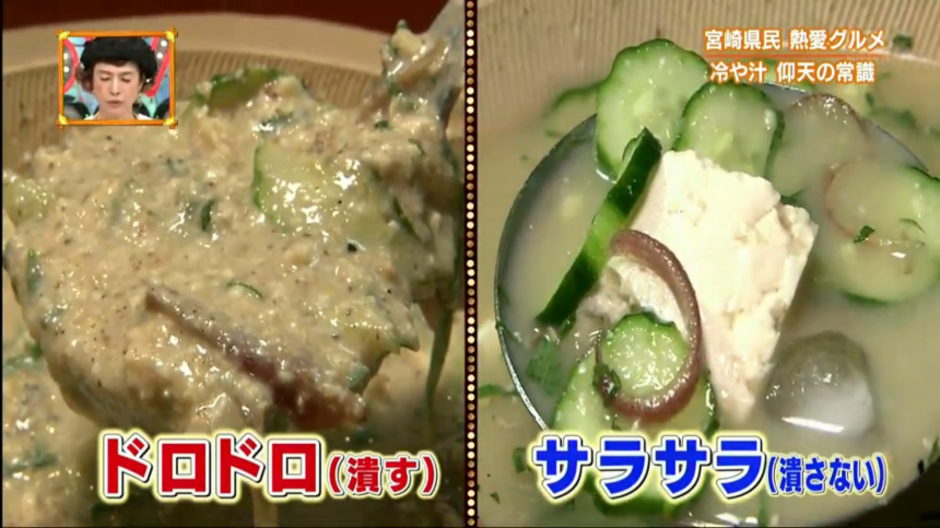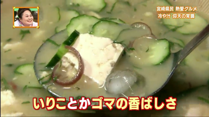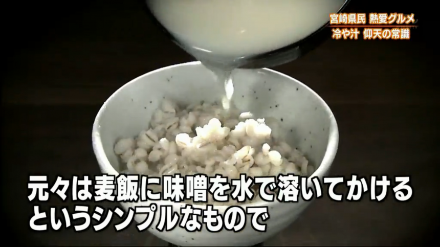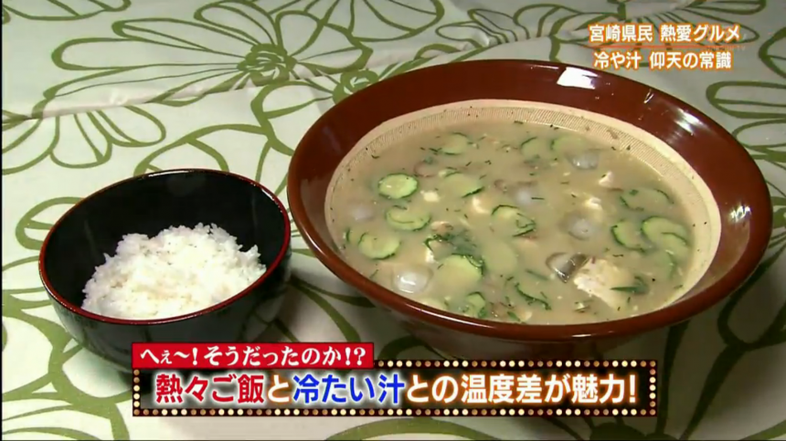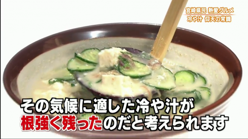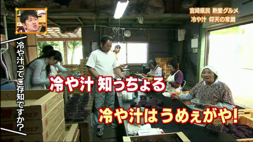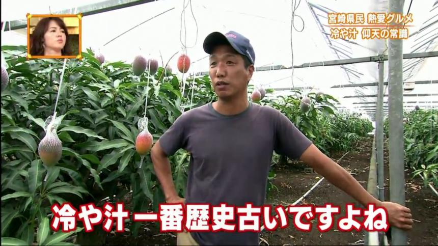 其實宮崎縣的鄉土料理挺有名的,叫作「冷や汁」,先可理解為冷汁。電視節目《日本妙國民》的工作人員到訪宮崎,四處訪問縣民「有沒有聽過冷汁」。這位芒果農民說:「(宮崎縣)有芒果,有地雞,但冷汁才是歷史最久的。」