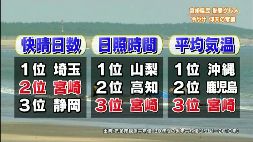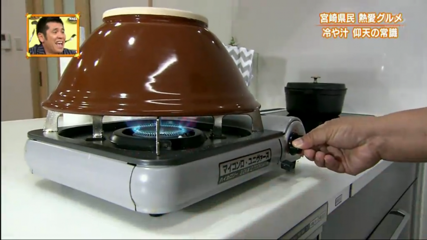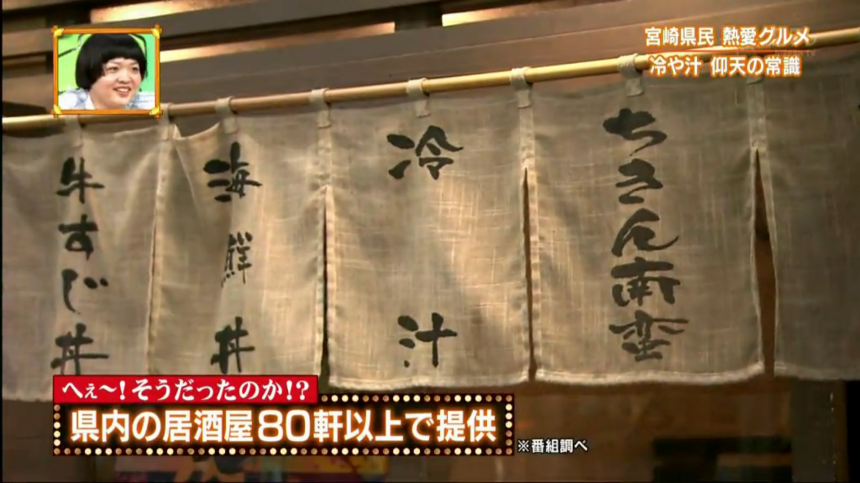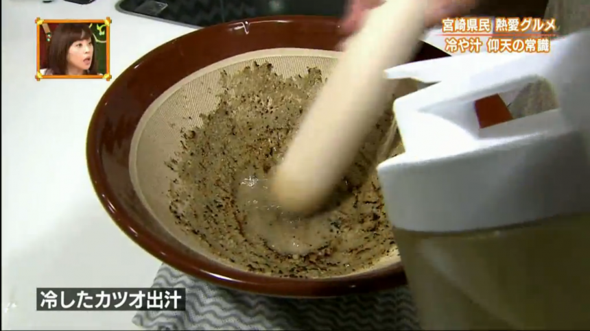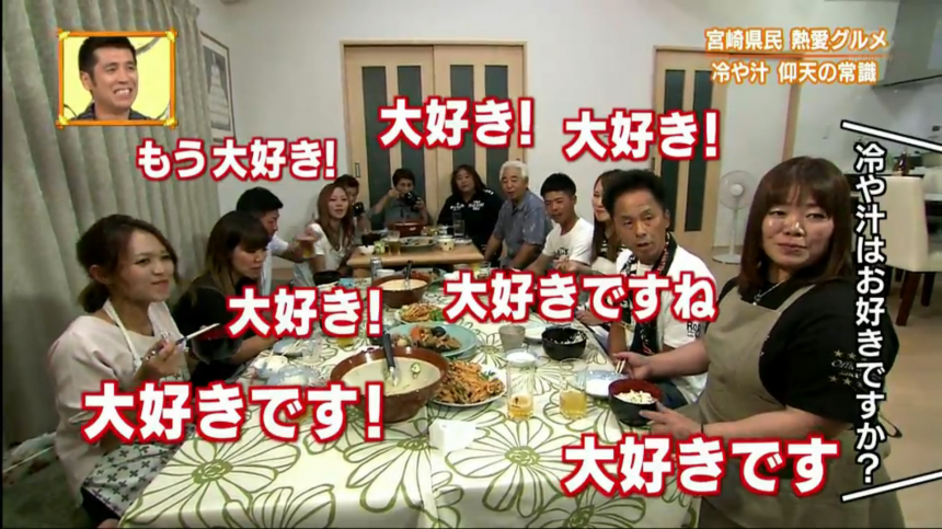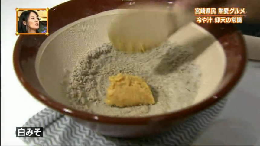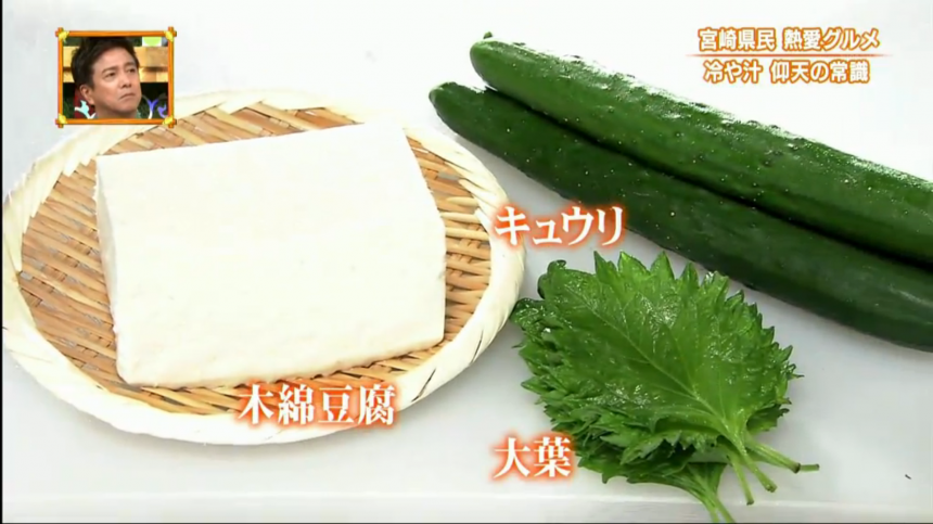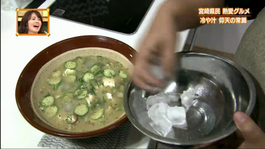 其實宮崎縣的鄉土料理挺有名的,叫作「冷や汁」,先可理解為冷汁。電視節目《日本妙國民》的工作人員到訪宮崎,四處訪問縣民「有沒有聽過冷汁」。這位芒果農民說:「(宮崎縣)有芒果,有地雞,但冷汁才是歷史最久的。」