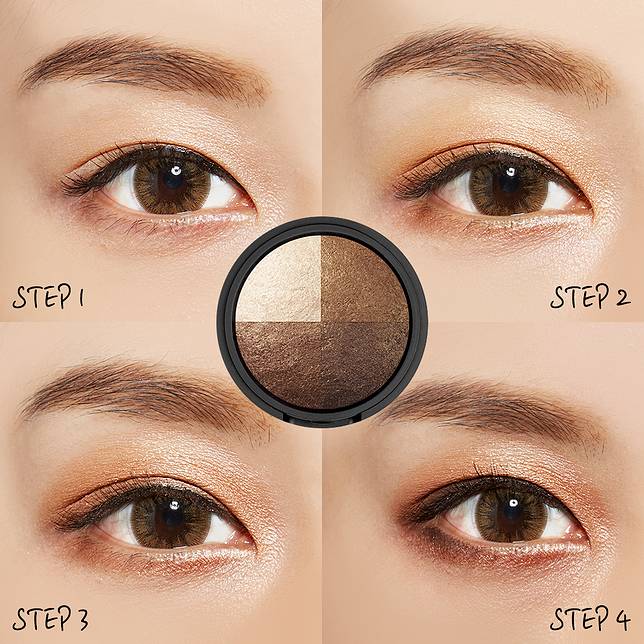 Step1:淺色打在整個眼窩,為眼睛打底 Step2:疊上偏金的咖啡色,加強眼窩深邃度以及臥蠶 Step3:塗在眼尾向前暈染,增加眼妝層次感 Step4:用深咖啡色製造假眼線,並加強眼尾ㄑ字部位