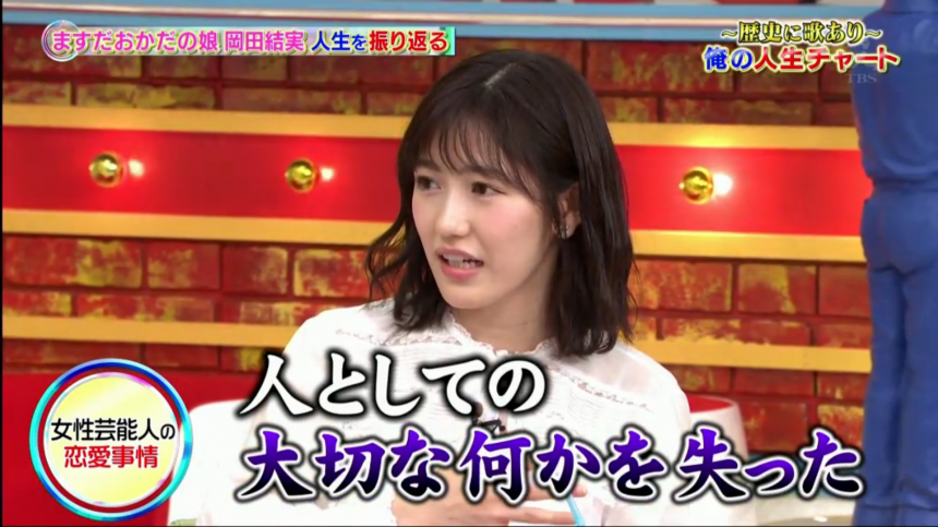 麻友向來都自稱對戀愛沒有興趣,十多歲的時候最愛動漫畫,後來又喜歡上寶塚,跟其他成員不同,從來都不會跟男明星聚會。在這個節目上,麻友又再重申:「回想過去的話,由小學或幼稚園開始,未曾對男性抱有好感。(比起戀愛)我更喜歡自己的興趣,小學時代就已經沉迷看漫畫…」中居不信,又再追問:「不是不記得初戀,而是從未有過初戀?」麻友回答:「從未試過羨慕別人有男女朋友。從小開始,又完全沒有這種感覺…」曾經橋本環奈也有說過類似的說話「至今為止都沒有對人心動過……」,也許觀眾會覺得這是偶像的模範回答,但我覺得這兩位女性具有偶像意識,對自己非常嚴厲,一定是把支持者放在第一位吧。