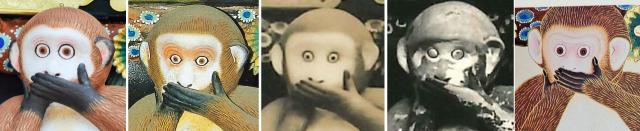 上圖從左起分別是「不言」猴子在這次整修後、1973年整修後、1951年整修後及1923年整修後的外觀。上一代的猴子眼睛比較小,其實已經比前一代的大。黑白照的是1923年整修後的版本,不過是攝於1951年準備修復時,從照片可見塗裝已經損毀不少。至於最右邊的,是這次整修的參照圖。