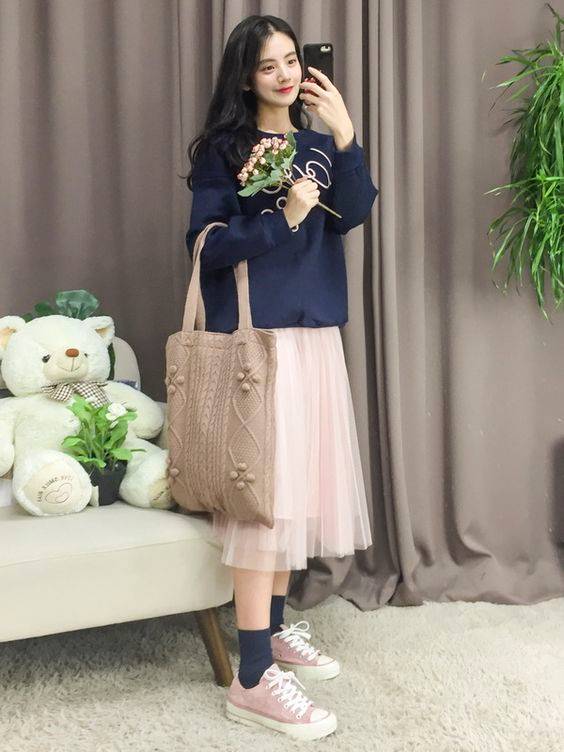 深藍x淺粉紅也是另外一種少女感顏色,深藍色衛衣相信不少女生家中都會有一件吧~
