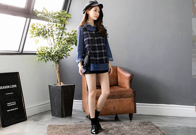 如果不習慣穿洋裝的女孩,也可以走一下知性文青風!知性風,最好的搭配單品絕對非牛仔與格紋莫屬了,這件混合這兩項元素的假兩件上衣,下半身無論搭配牛仔褲或是西裝褲,都非常好看,再穿上簡單的平底鞋,哇~真的非常搭配呢!