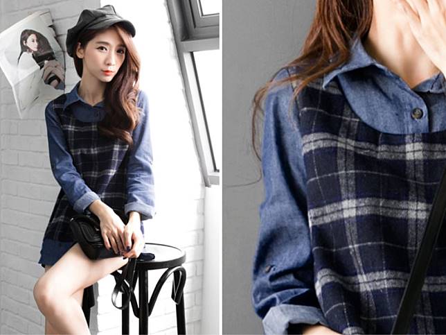 尾牙穿搭推薦5:牛仔領拼格紋 仿毛料假兩件式長版上衣>>