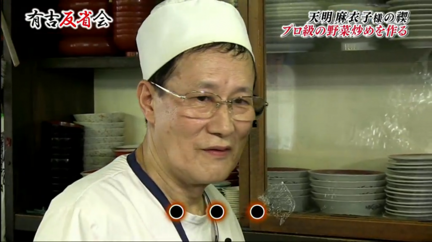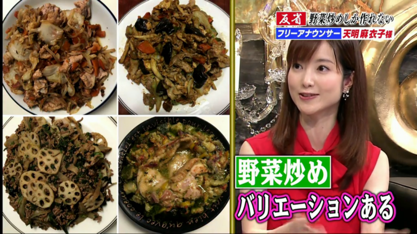 東大畢業的女主播天明麻衣子,日前在節目《有吉反省會》上自白「只懂得炒菜」她跟丈夫每天晚上都吃著這種茶色的炒菜,足足有三年。主持人問:「以為妳東大畢業、又這麼漂亮,一定很擅長料理……為什麼只會炒菜呢?」天明小姐解釋,從來沒有在學校學習過烹調,料理也不是考試範圍,自然就沒有花時間去學。而且,她認為學習不同菜色的做法實在太低效率,而炒菜是一道簡單、營養均衡、可以短時間完成的料理,所以每天都炒菜是最合理的做法。天明小姐為了省時間,會購買預先切好的蔬菜和肉類(省掉處理材料和洗用具的時間),然後把所有材料倒進鍋裡炒,五分鐘就能完成晚餐。