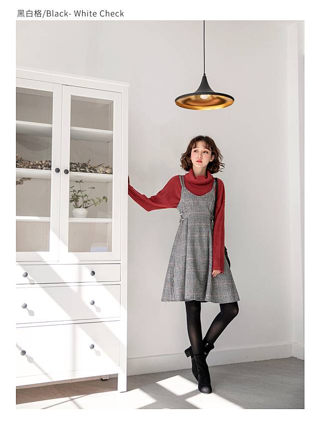 尾牙穿搭推薦3:毛呢英倫 格紋雙肩吊帶洋裝.2色>>